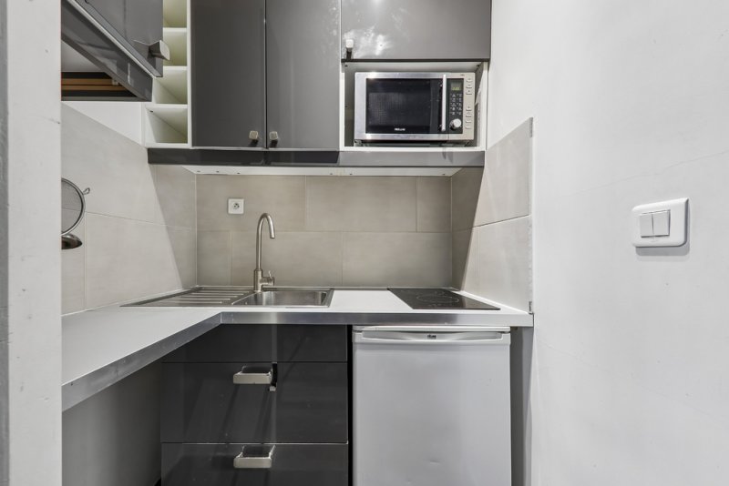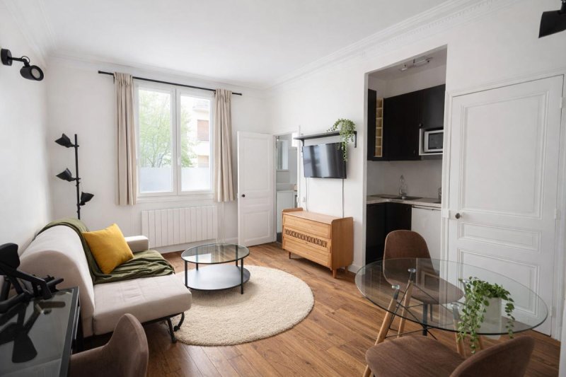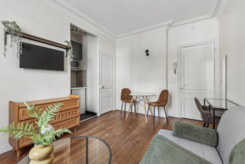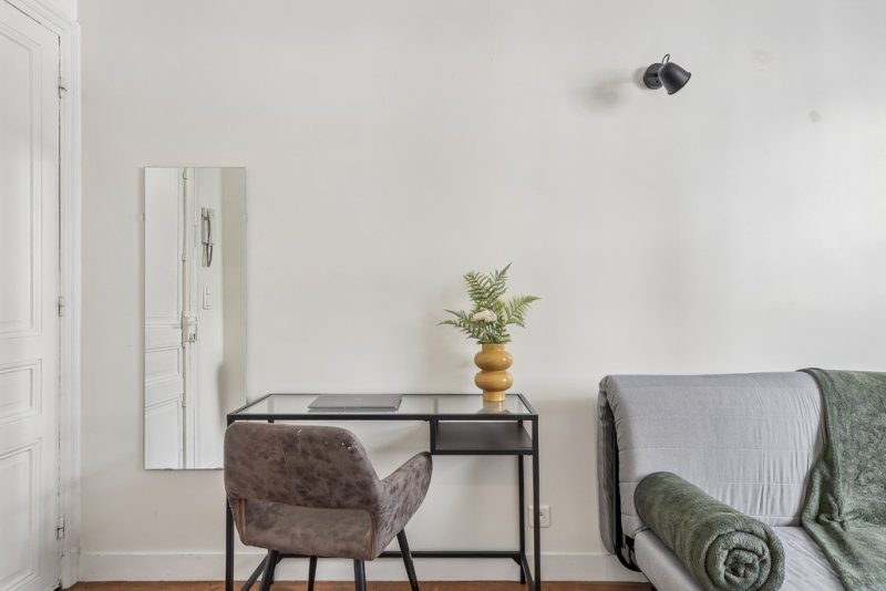 L'espace de vie, parfaitement optimisé, comprend une pièce principale avec canapé-lit, espace repas et coin bureau, ainsi qu'une cuisine entièrement équipée. Un grand placard permet un rangement fonctionnel ou l'aménagement d'un dressing.