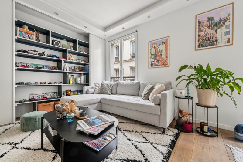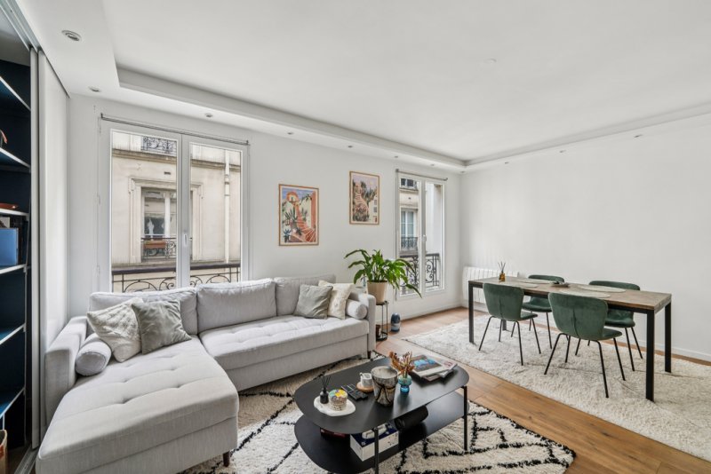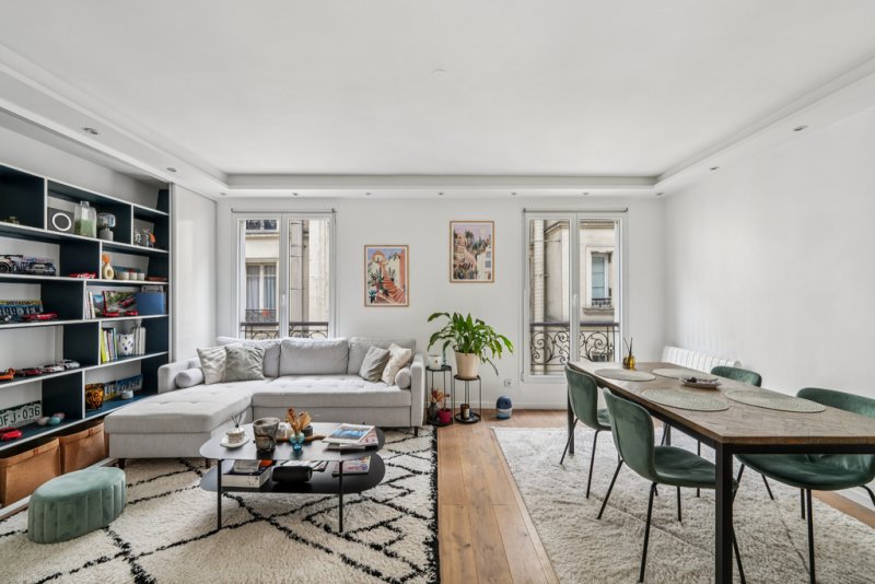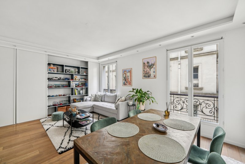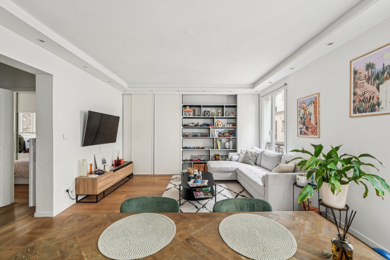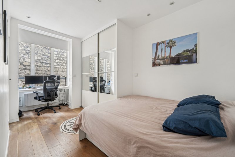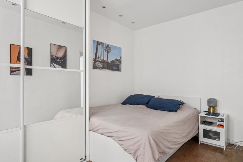 L'appartement se compose d'un double séjour lumineux de 24,4 m², d'une cuisine ouverte et entièrement équipée de 4,9 m², parfaitement intégrée à l'espace de vie, d'une chambre de 11 m² avec bow-window, idéale pour aménager un coin bureau, ainsi que d'une salle d'eau avec WC de 3,5 m².