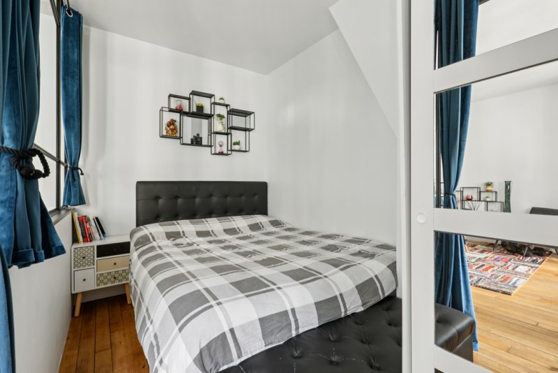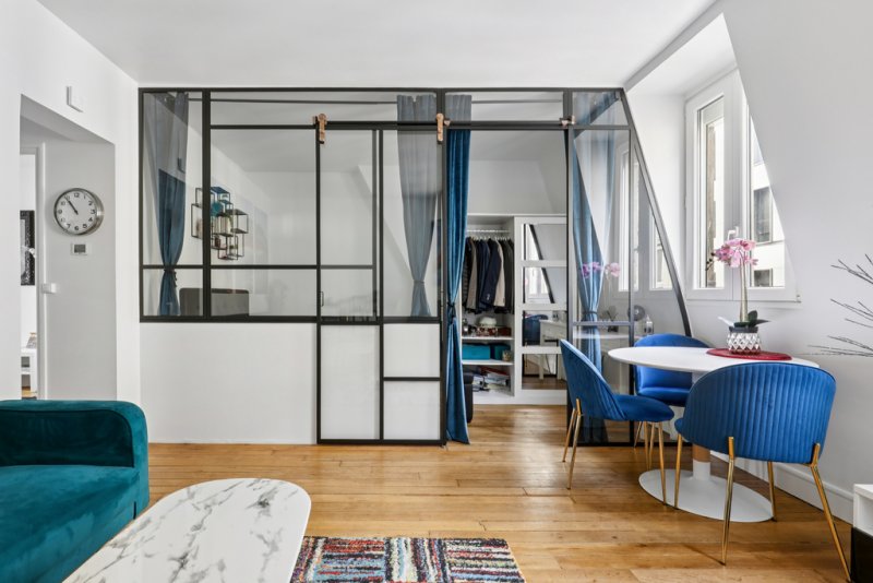 L'appartement se compose d'une entrée séparée, d'un séjour lumineux, d'une cuisine intégrée, d'une chambre principale, ainsi que d'une seconde pièce aménagée derrière une verrière, idéale en chambre secondaire ou grand bureau. Une salle d'eau complète l'ensemble.