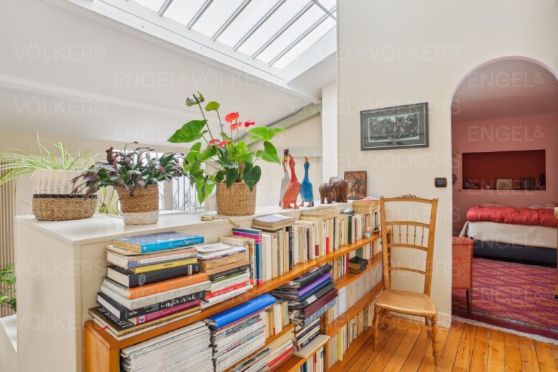 Cet atelier de sculpteur bénéficie d'une hauteur cathédrale sous verrière exceptionnelle : 7m20 au plus haut et 5m50 au plus bas et a gardé tout son cachet.