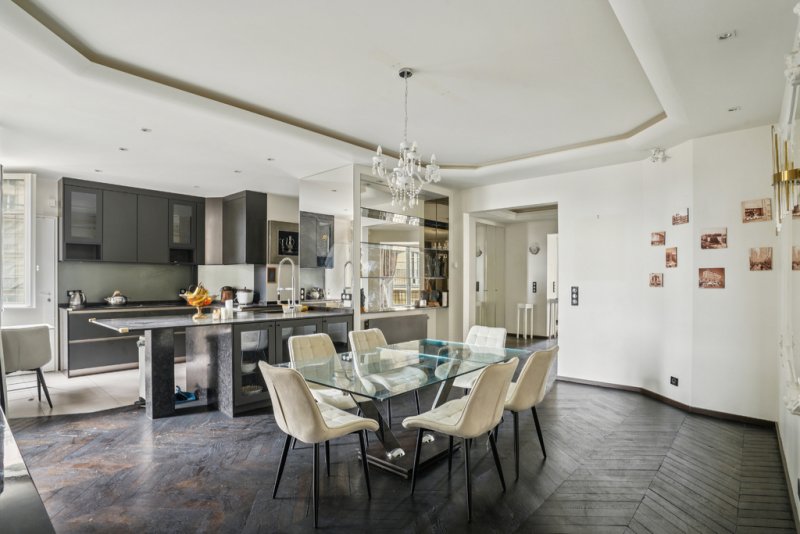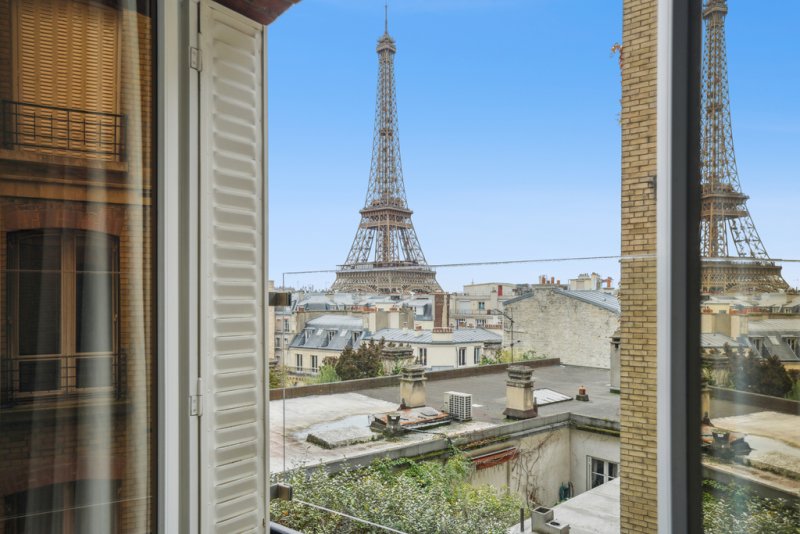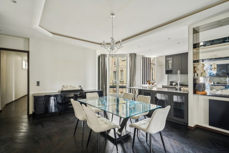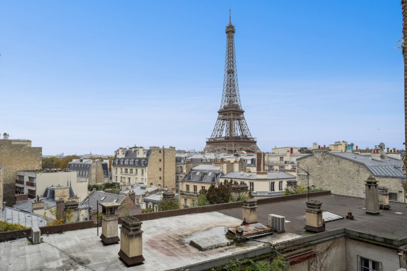 La cuisine indépendante est partiellement ouverte sur la salle à manger. L'appartement comprend actuellement trois chambres dont une suite parentale avec sa salle de bain et deux chambres partageant une salle d'eau. Une des chambres est dotée d'un cheminée et d'une vue Tour Eiffel de plain pied.