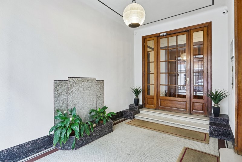 La façade en céramique, les mosaïques, les portes en bois d'époque et les vitraux des années 1930 dans la cage d'escalier témoignent du soin apporté à l'architecture de l'immeuble.