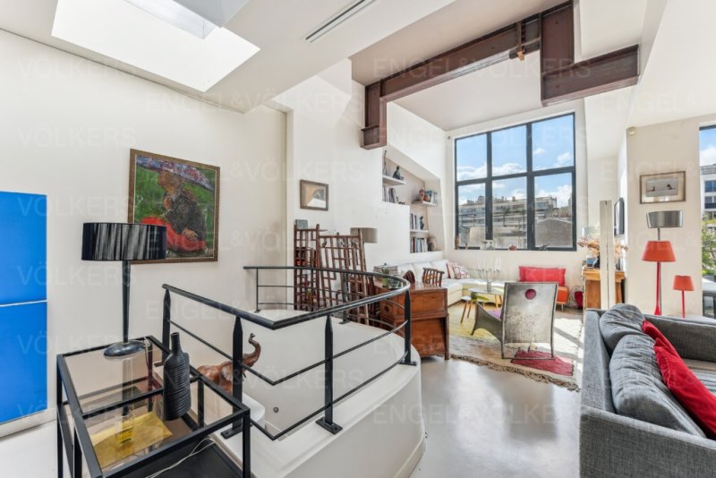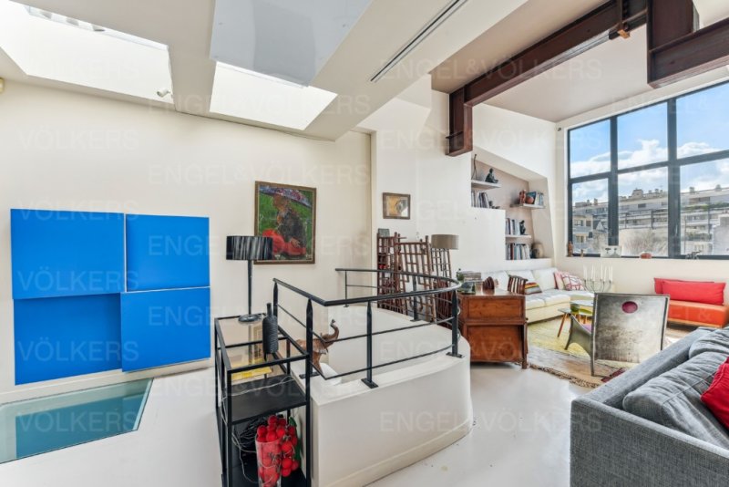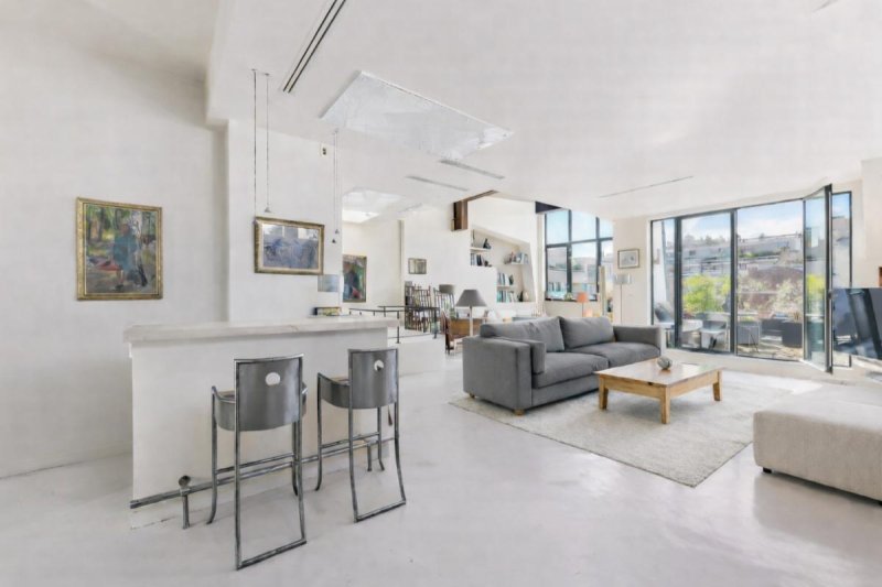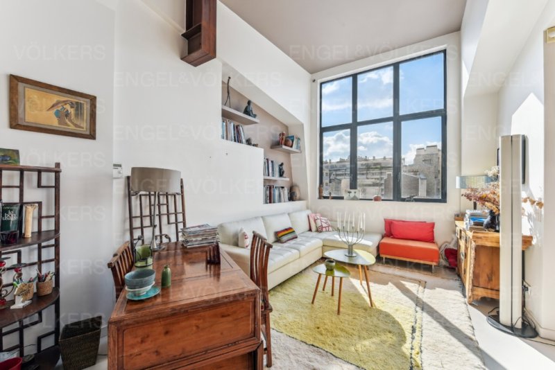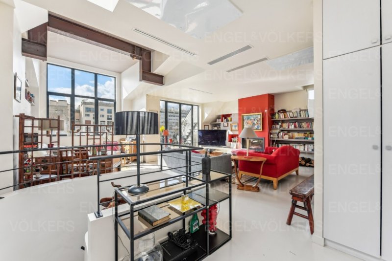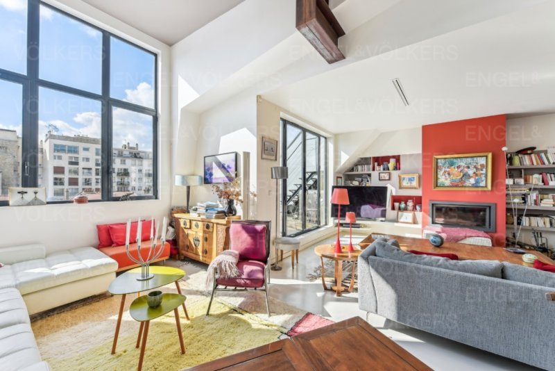 Au dernier étage, accessible par un ascenseur privatif et sécurisé, un double salon, une salle à manger, lumineux et traversant et une cuisine semi-ouverte, le tout avec une très belle hauteur sous plafond, semblable à un atelier d'artiste, et sa cheminée avec insert.