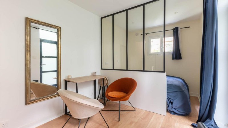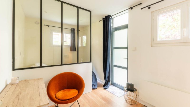 Entièrement rénovée avec goût, elle se compose dès l'entrée d'un espace de vie intelligemment pensé, divisé en deux zones distinctes -- un coin salon et un coin nuit -- séparées par une élégante verrière, apportant luminosité et caractère à l'ensemble.
