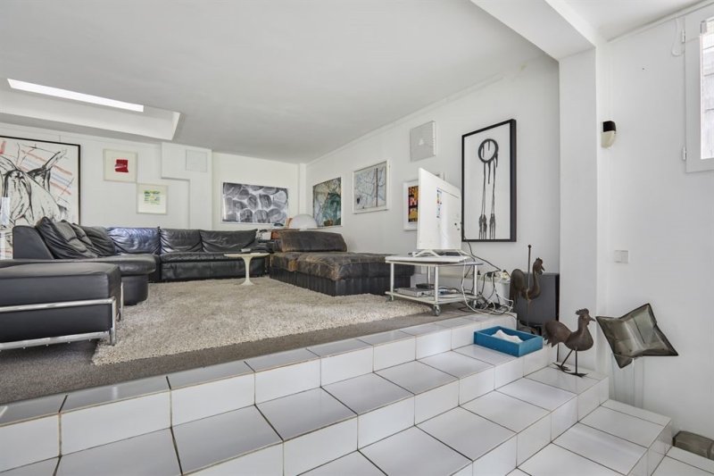 - une volumineuse pièce principale à vivre d'environ 60 m2, agencée en trois espaces dont une cuisine ouverte, une salle à manger et un séjour en surplomb accessible par de larges escaliers