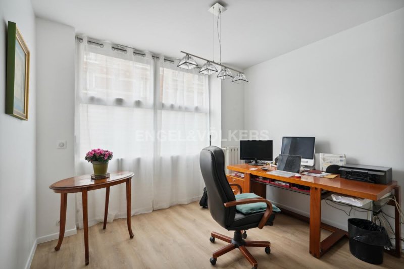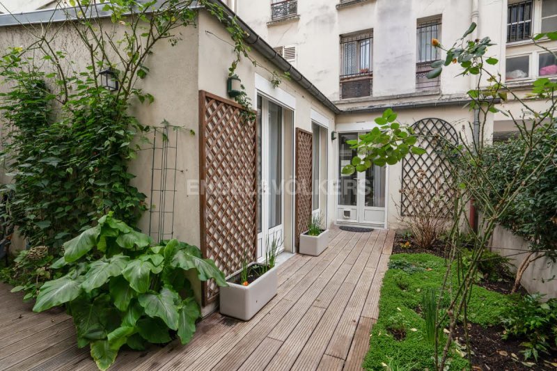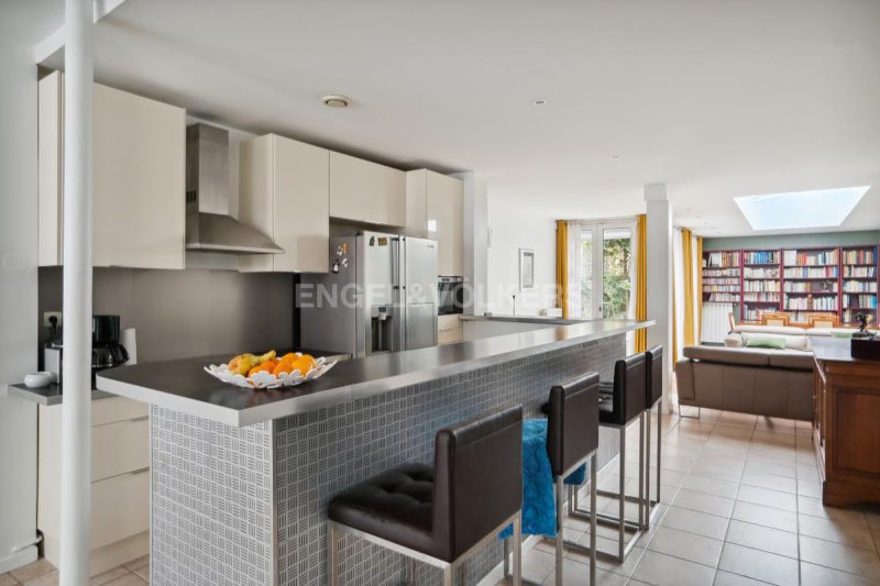 L'appartement de 107m² (en surface pondérée, 113 m² habitables) se compose au rez-de-chaussée d'une grande pièce à vivre de 53m2 avec cuisine ouverte sur le salon et accès direct à un jardin d'environ 44m², d'une chambre, d'un bureau pouvant faire office de chambre d'enfant, d'une salle d'eau et de toilettes séparés. Au sous-sol une ancienne cave voûtée de 28m² est aménagée en espace nuit avec salle de bains dans un esprit zen et méditatif. L'appartement rénové bénéficie dans le salon d'une lumière zénithale en plus de grandes baies vitrées ouvrant sur le jardin. La lumière et le calme donnent à l'ensemble une atmosphère bienveillante et conviviale.