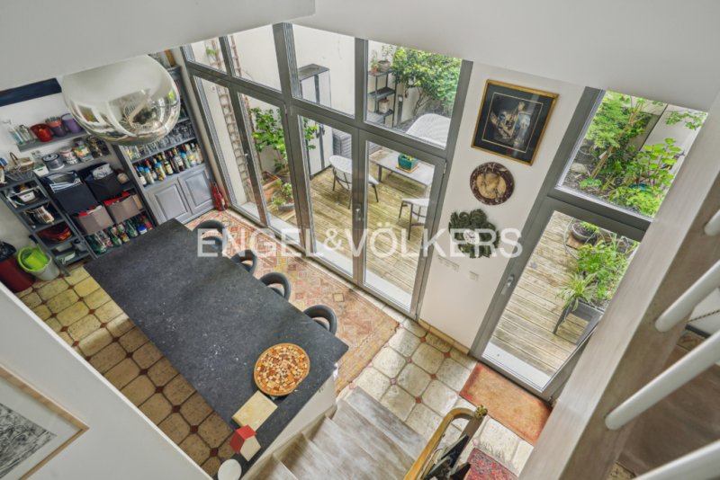 Au rez-de-chaussée, vous découvrirez un vaste salon et une cuisine ouverte, caractérisés par une impressionnante hauteur sous plafond de type cathédrale. Ce niveau comprend également une salle d'eau et, en son centre, un agréable jardin/terrasse aménagé de 30 m². Vous bénéficierez aussi d'une belle entrée privative de 20 m².