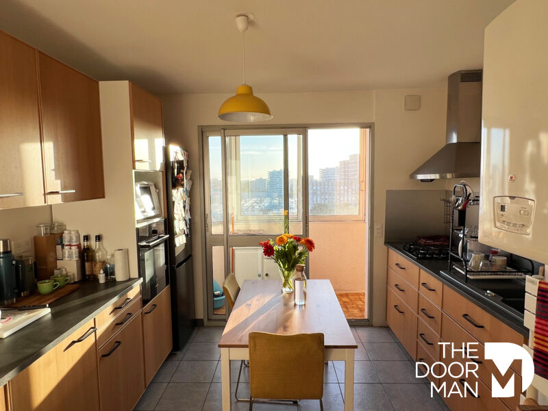 Pièce de vie lumineuse sur balcon, cuisine aménagée avec loggia, 2 chambres, salle d'eau, wc.