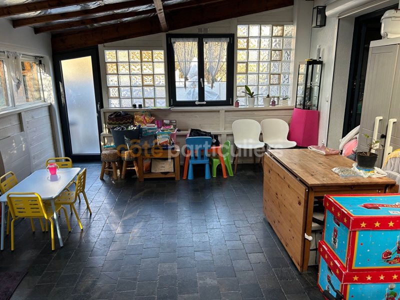 A mi chemin entre la maison et l'appartement comprenant : entrée avec placard, séjour avec cheminée donnant sur véranda et jardin, cuisine meublée et équipée (sauf frigo), deux chambres avec placards, salle de bains, WC.