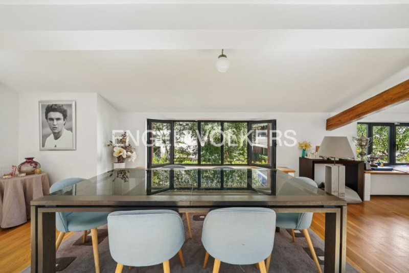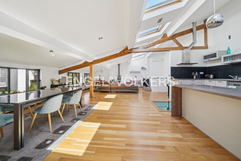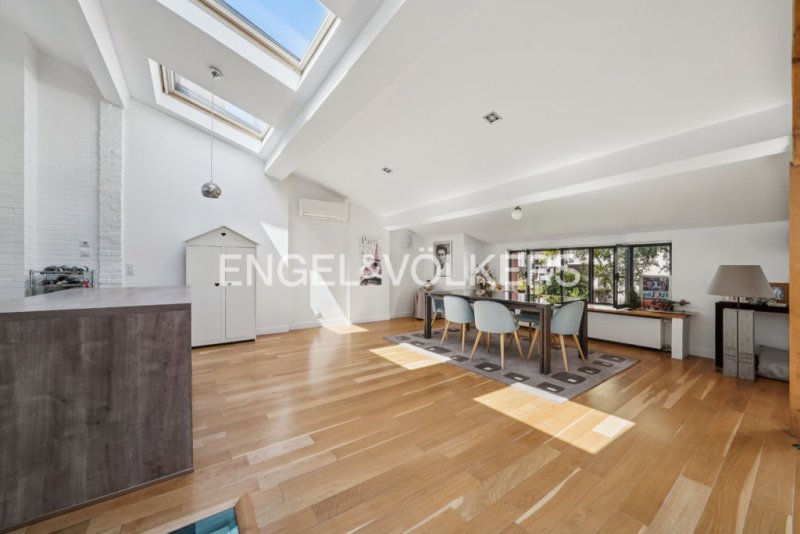 - à l'étage : un vaste espace de vie avec climatisation de 75 m² offrant de beaux volumes comprenant salon - salle à manger - cuisine ouverte, très lumineux grâce aux nombreuses fenêtres et puits de lumière, avec une vue dégagée sur jardin, au calme.