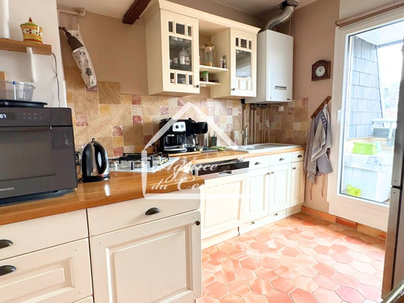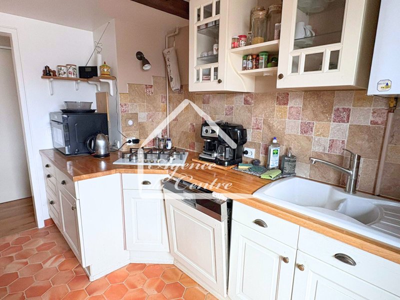 Une entrée baignée de lumière vous accueille et mène à une cuisine équipée au charme indéniable, disposant d'un passe-plat ouvert sur le séjour.