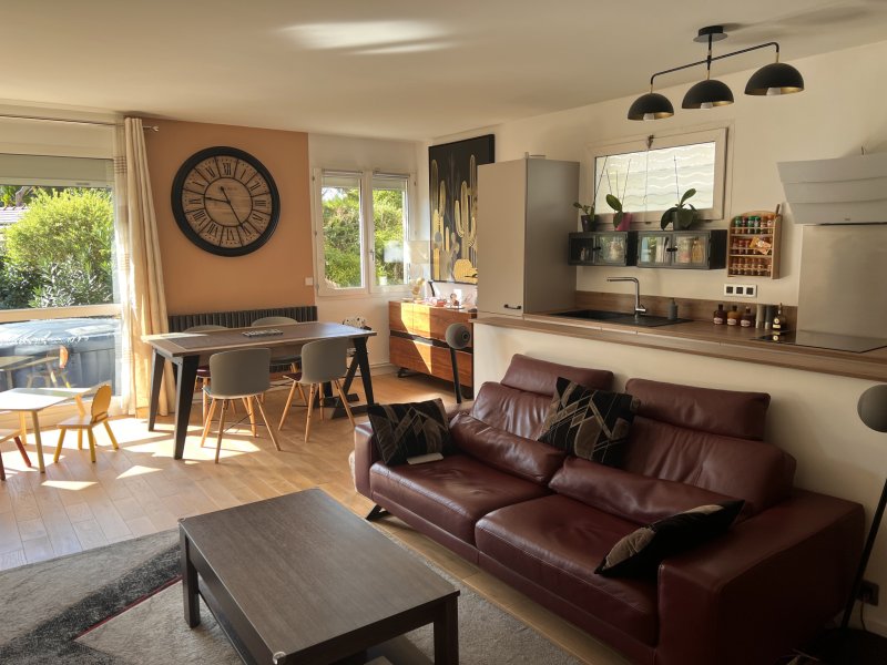 Chatou limite Montesson, à proximité des commerces et des écoles, petite résidence de standing parfaitement entretenue, au calme et sécurisée. Vaste appartement 3 pièces en rez-de-jardin, composé d'une entrée, cuisine ouverte équipée, séjour lumineux sur terrasse de 35 m2, 2 chambres, dont une suite parentale avec salle d'eau, salle de bains, nombreux rangements.Très bon état général. Jardin de 170 m2. Parking et cave en sous-sol. Chauffage individuel au gaz. Ravalement récent.