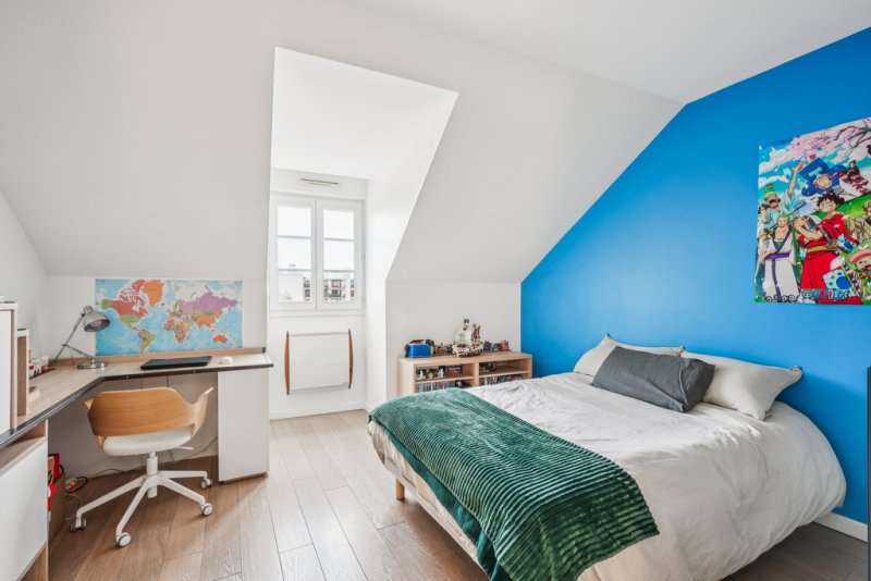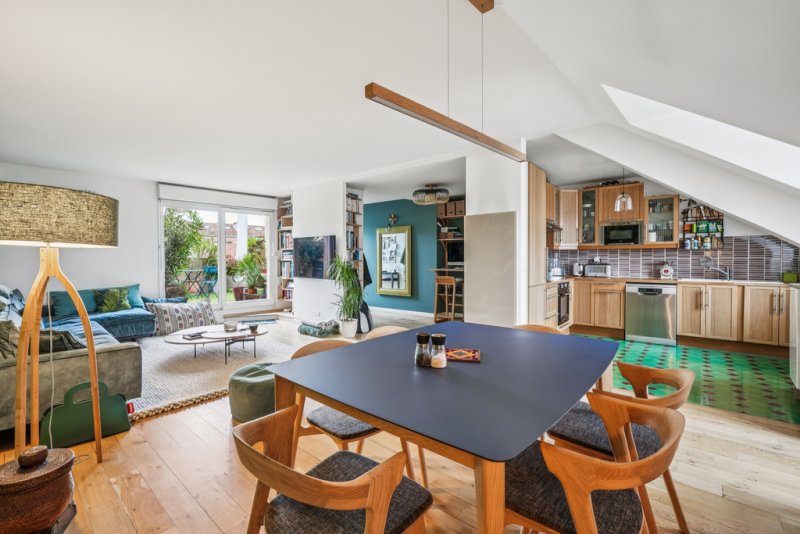Traversant Est/Ouest, il offre une pièce de vie généreuse avec cuisine ouverte aménagée et équipée, trois chambres dont une suite parentale avec salle d'eau, une salle de bains, un WC séparé et de nombreux rangements en sous-pente.