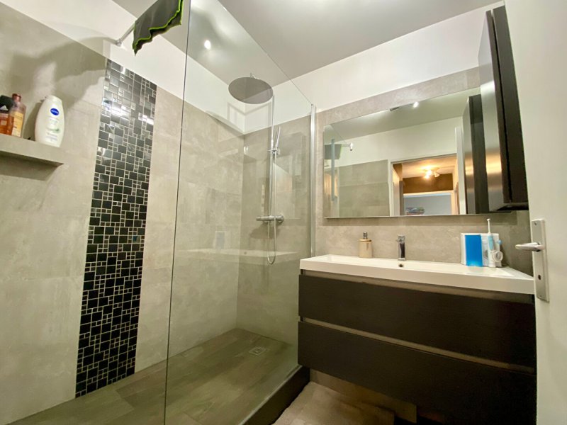 Entrée avec placards, séjour donnant sur grand balcon de 10 m², cuisine aménagée et équipée, chambre avec placards, belle salle d'eau rénovée récemment, et WC.