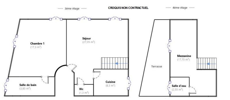 Il se compose d'une vaste pièce de réception baignée de lumière avec un séjour cathédrale, d'une cuisine aménagée, ainsi que d'une grande suite parentale de 23,45 m² au sol (17,30 m² Carrez), avec sa salle de bains et des WC séparés.