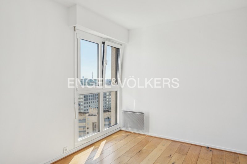 Depuis plusieurs pièces, la vue s'étire jusqu'à l'horizon parisien : entre ciel et ville, la silhouette délicate de la Tour Eiffel se devine, apportant une touche d'exception au quotidien.