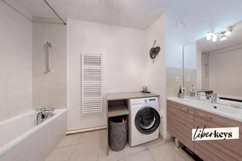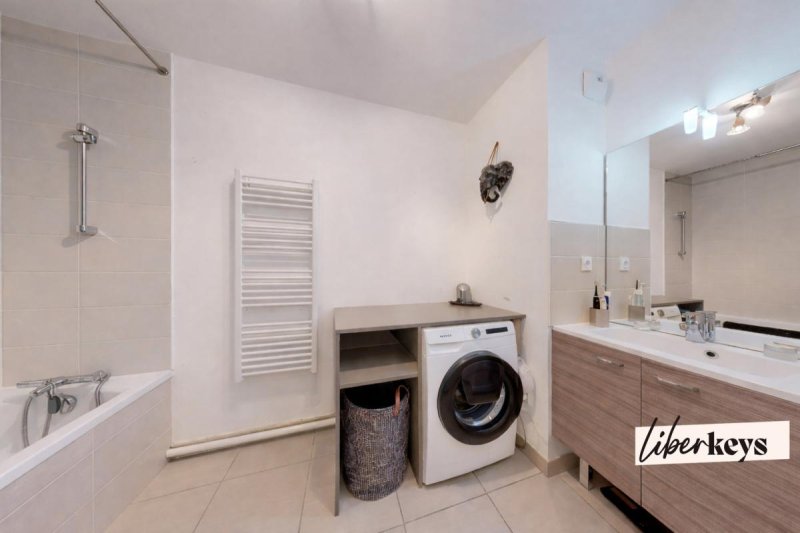 Salle de bains : volume généreux avec baignoire et espace buanderie.