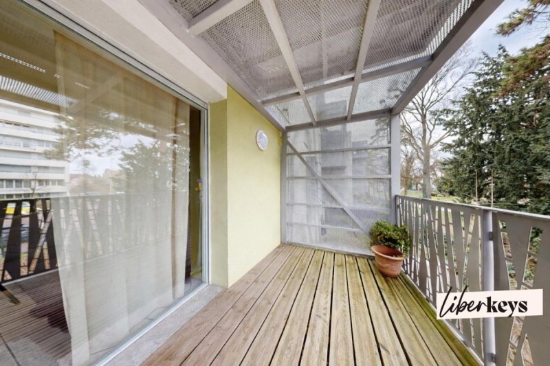 Extérieur : accès direct depuis le salon à une terrasse sans vis-à-vis, avec vue dégagée sur un parc.
