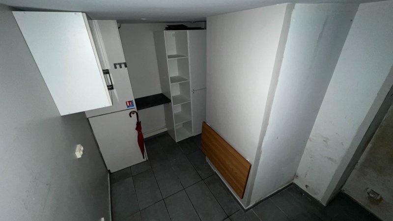 Grande pièce de 21 m2 au rez-de-chaussée, avec accès à la cour intérieure par porte de service. Sous-sol de 13m2 aménagé en réserve avec rangements et WC.