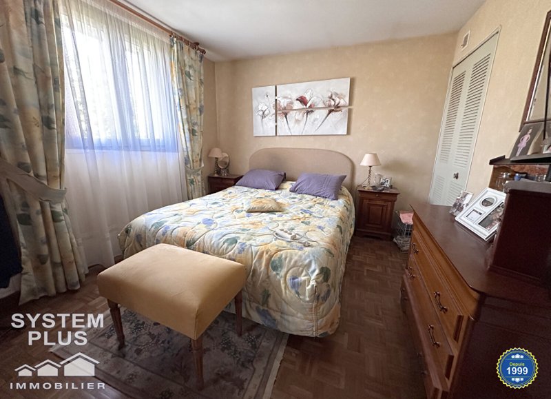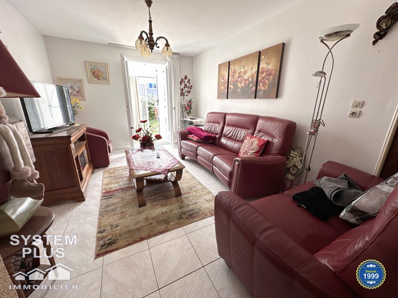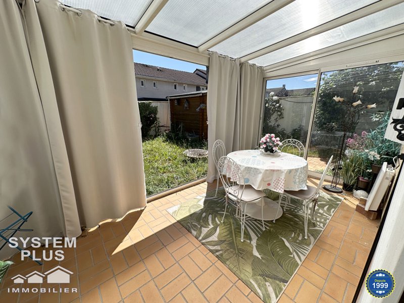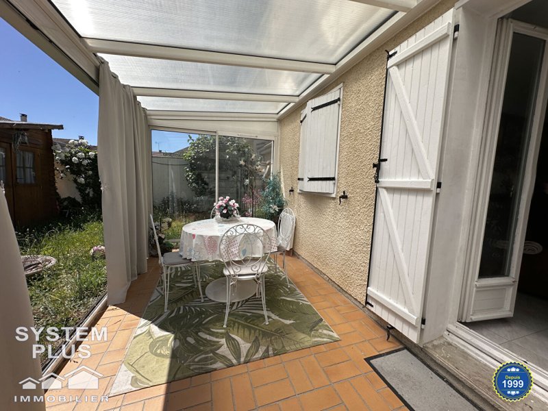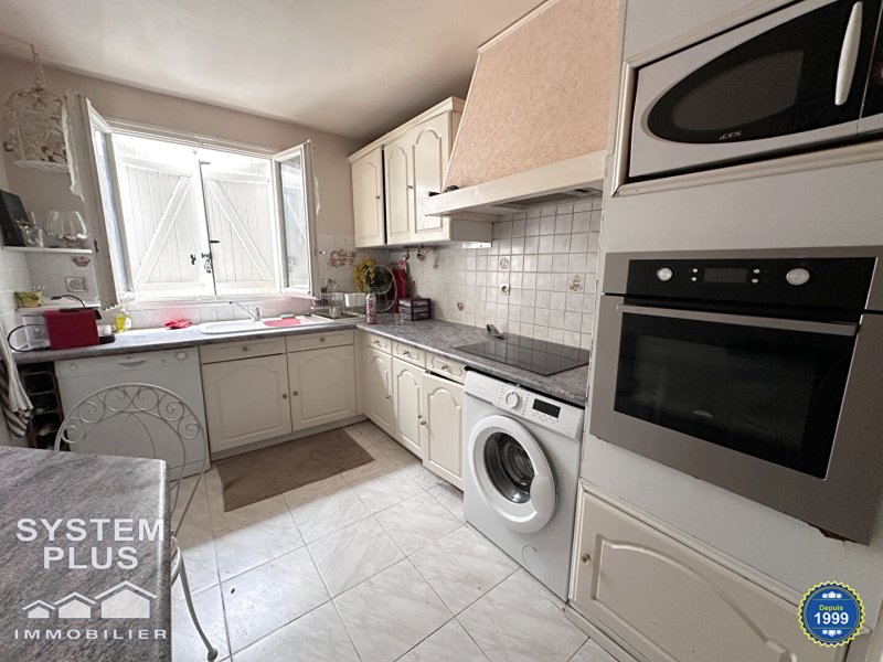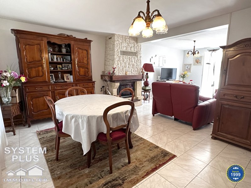 Dans quartier pavillonnaire, maison comprenant entrée avec placard, cuisine aménagée équipée, séjour 34m² avec cheminée insert et donnant sur véranda et jardin, wc.