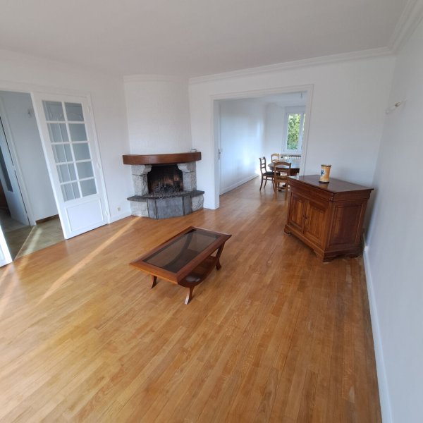Entrée, séjour traversant et très lumineux de 30 m² avec cheminée et balcon avec vue dégagée, ainsi qu'une cuisine équipée dinatoire.
