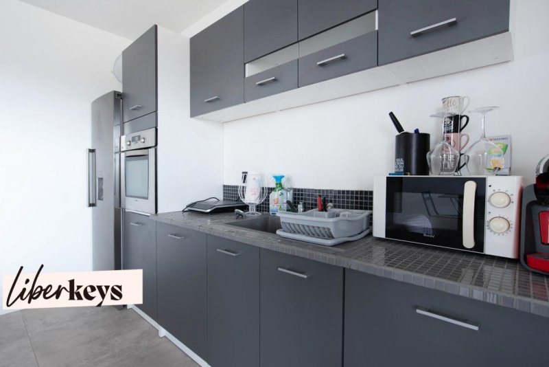A l'étage, le salon de 50 m², s'ouvre sur une terrasse ensoleillée, qui donne une vue imprenable sur le fameux Rocher de Roquebrune et sur une cuisine américaine de 12 m², équipée haut de gamme.