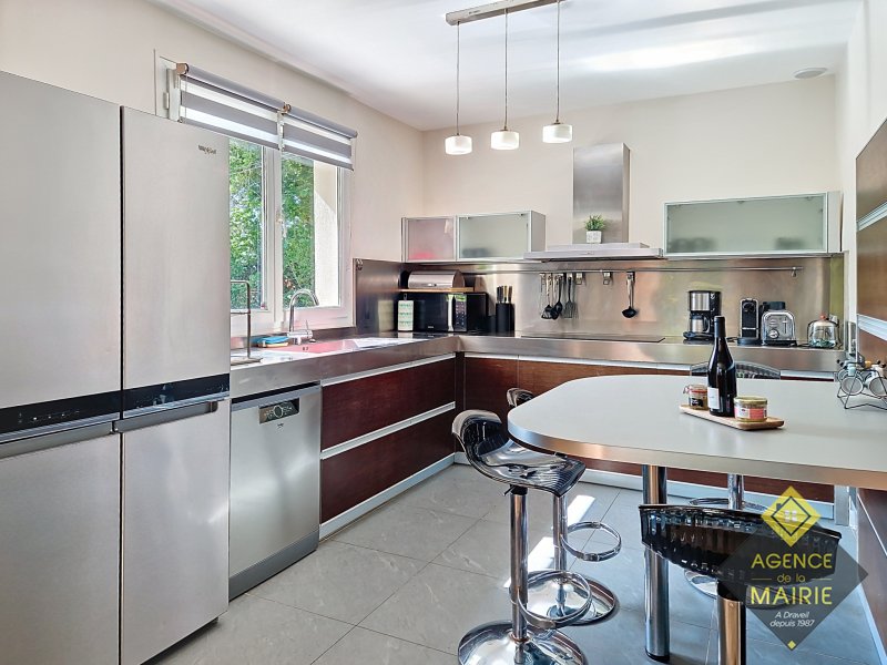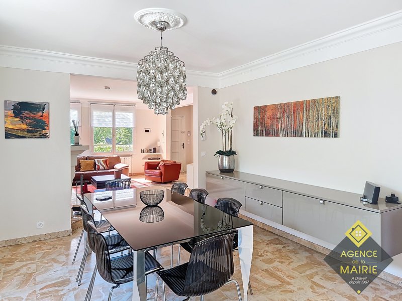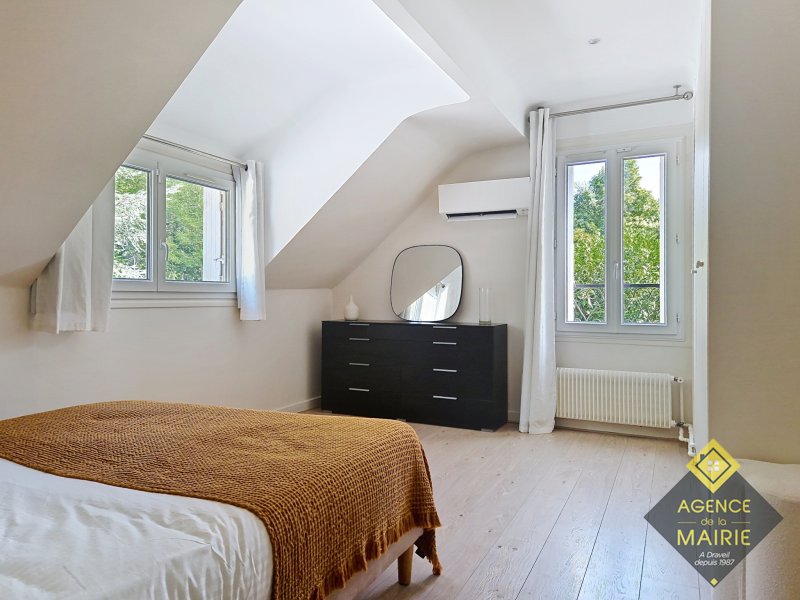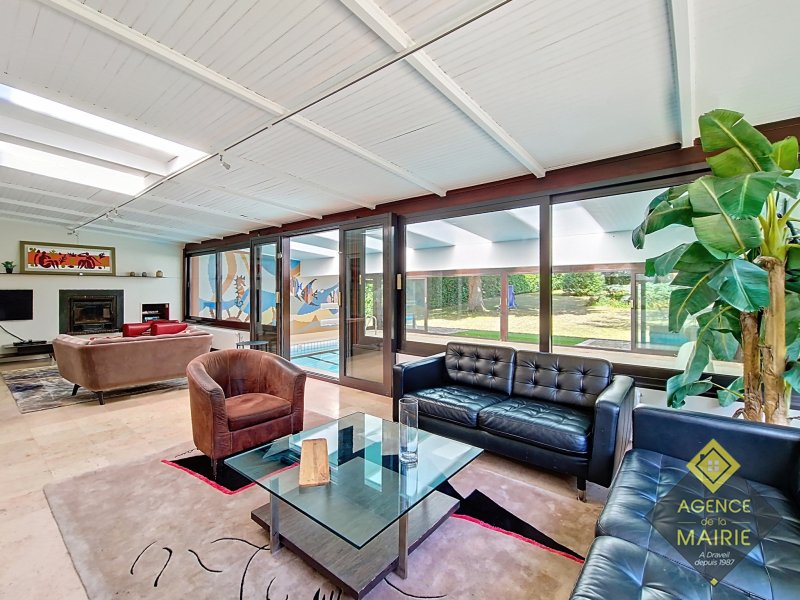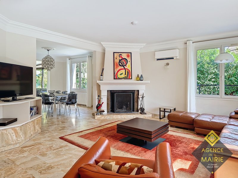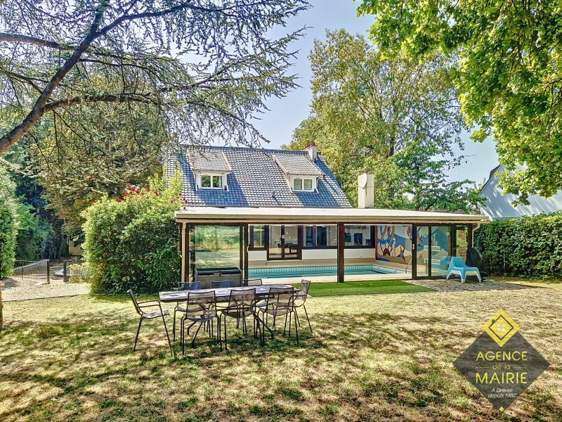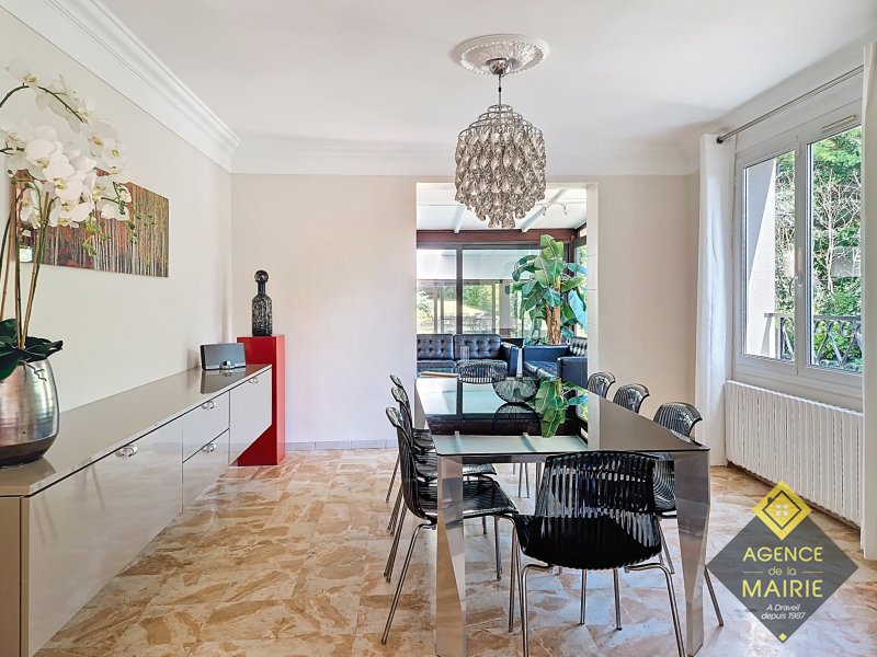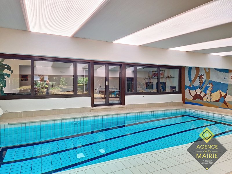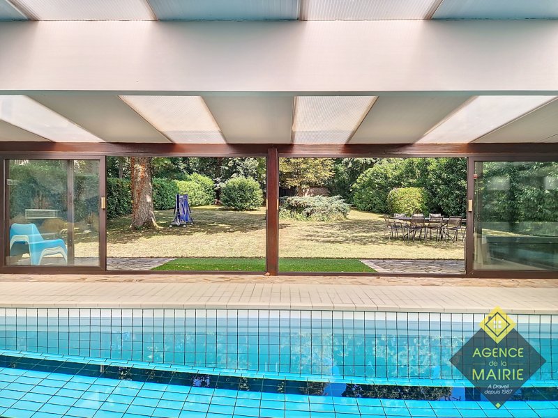 A Draveil, quartier Champrosay, exceptionnel, propriété au coeur d'un magnifique jardin 2913 m2, en lisière de forêt de Sénart. La maison principale de +170m2 hab environ se compose: Au rez de chaussée: d'une entrée, une cuisine équipée électroménager neuf, un salon avec cheminée, une salle à manger et un petit salon de réception donnant sur une piscine couverte puis au parc. Une chambre, salle de bains récente et toilette indépendant. A l'étage: un dégagement dessert 3 chambres, salle de bains avec baignoire et douche, wc. Un sous sol total avec cave, cave à vins, lingerie, rangement et garage double. Une dépendance aménagée en appartement avec une chambre, coin cuisine et salle d'eau avec toilette + un abri de jardin de 20m2. Côté prestations: PAC Air/Eau, double vitrage, électricité refaite, portail et porte de garage auto, fibre, chargeur véhicule électrique, alarme, très grand parking à l'entrée. Possibilité d'acquisition avec tous les meubles. Prestations et cadre exceptionnel !