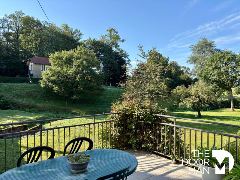Au rez-de-chaussée, vous découvrirez une vaste pièce de vie agrémentée d'une cheminée, une cuisine avec cheminée ouverte ainsi qu'une grande terrasse récente offrant une superbe vue dégagée sur la prairie.