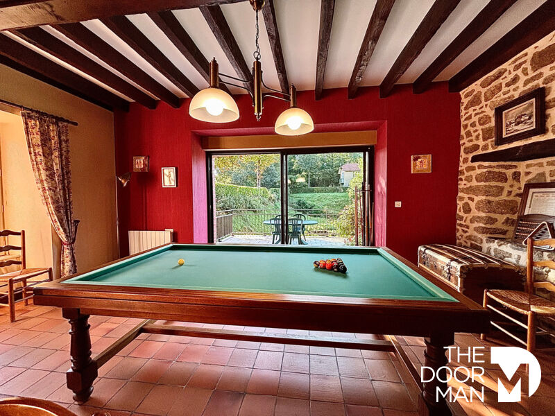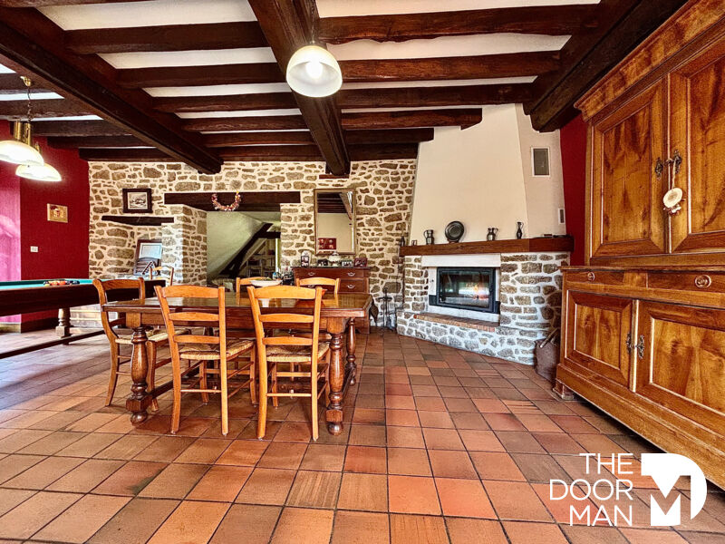 À l'extérieur, vous profiterez d'une vaste prairie traversée par un ruisseau, d'un pavillon annexe comprenant un grand garage au rez-de-chaussée et d'une pièce de vie à l'étage, d'un garage pour le rangement du bois et d'un grand étang poissonneux, bordé d'une pelouse parfaitement entretenue, idéal pour des moments de détente et de convivialité.