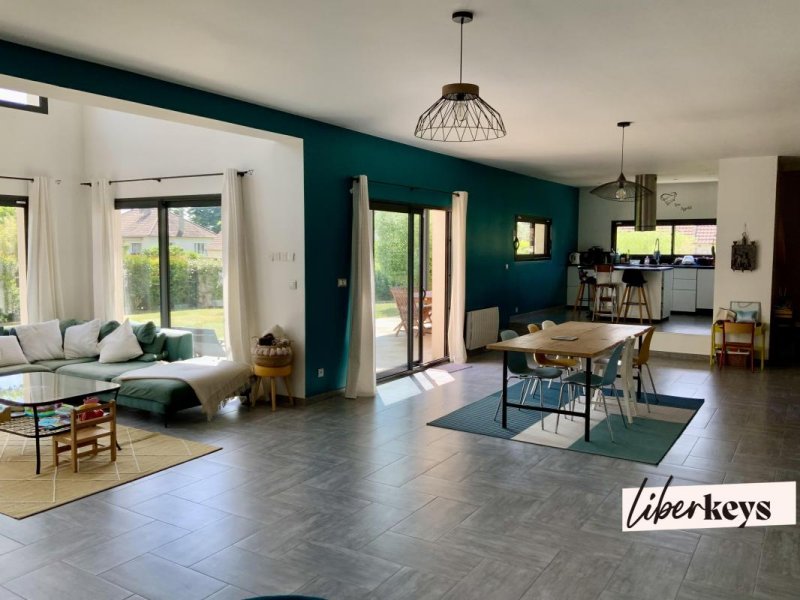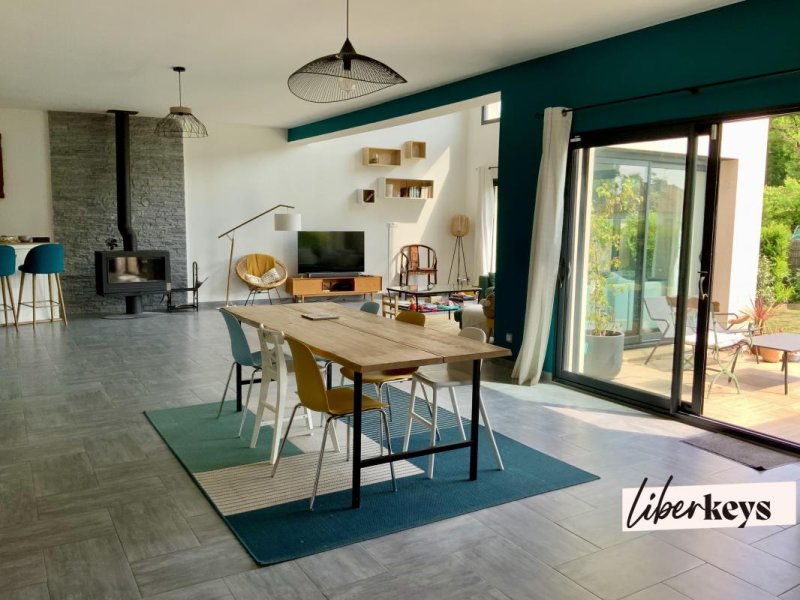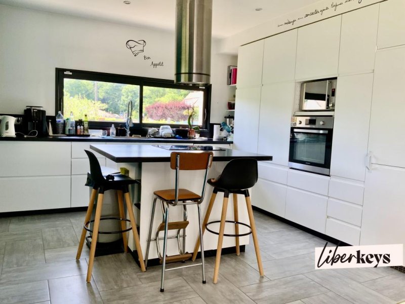 Dés l'entrée, vous serez conquis par sa pièce de vie de 75 m² réchauffée par son poêle à bois avec un superbe espace salon cosy, très lumineux grâce à son avec toit cathédrale et ses grandes baies vitrées offrant une lumière traversante et une vue apaisante sur le jardin. Cet espace s'ouvre sur une terrasse avec pergola, idéale pour profiter des beaux jours en famille. Une cuisine toute équipée ouverte sur la salle à manger.