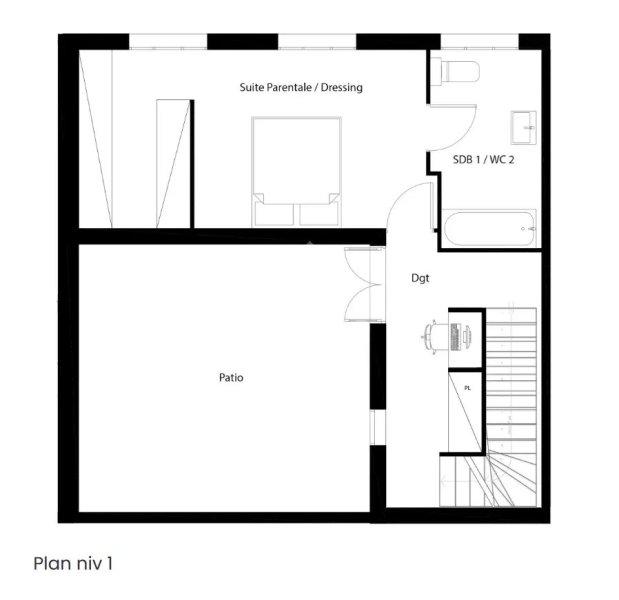 AU 1er ETAGE: Un dégagement donnant sur un grand patio et une suite parentale avec salle d'eau avec toilette.