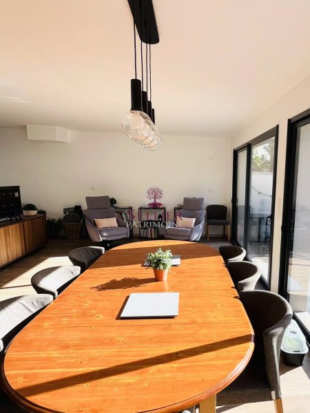 L'entrée dessert une pièce de vie de 48 m² avec sol en grès cérame grand format et chauffage au sol basse température. Les larges baies vitrées en aluminium (RAL 7016) ouvrent sur une terrasse plein ciel et un jardin paysager de 205 m² (figuiers,...