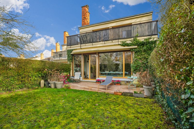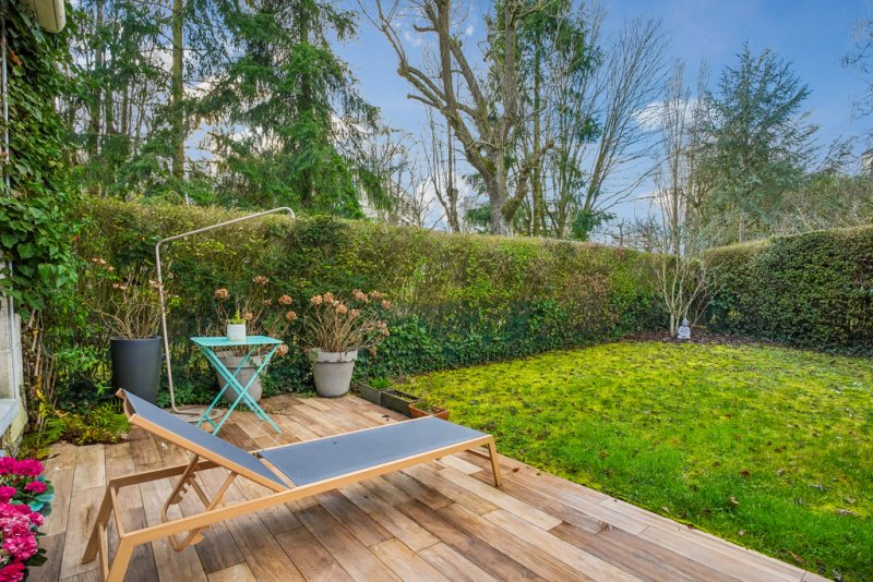 Le rez-de-chaussée propose une belle entrée avec placards, une vaste pièce de réception ouverte sur une agréable terrasse et un jardin arboré, sans aucun vis-à-vis, ainsi qu'une cuisine indépendante et fonctionnelle entièrement rénovée et des toilettes invités
