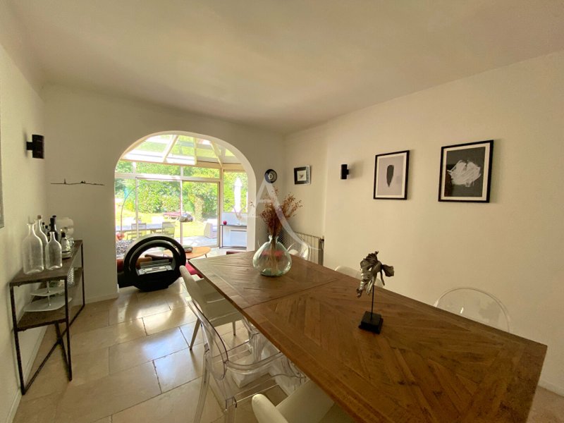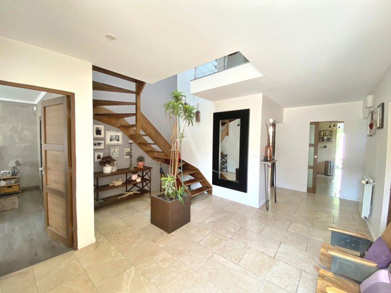 Un rez-de-chaussée avec une grande entrée, une salle à manger donnant sur un vaste salon, baigné de lumière naturelle s'ouvrant sur une véranda avec accès sur une grande terrasse, une suite parentale avec grand dressing et salle d'eau, une cuisine aménagée et équipée. A l'étage une mezzanine desservant quatre chambres et une salle de bains. Sous sol total. Emplacement de stationnement sur le terrain avec carport. Environnement très calme et verdoyant