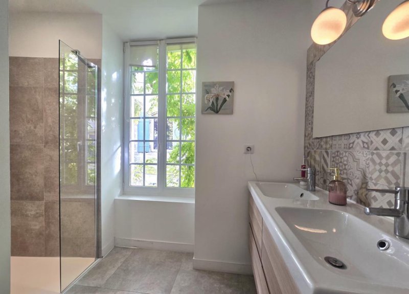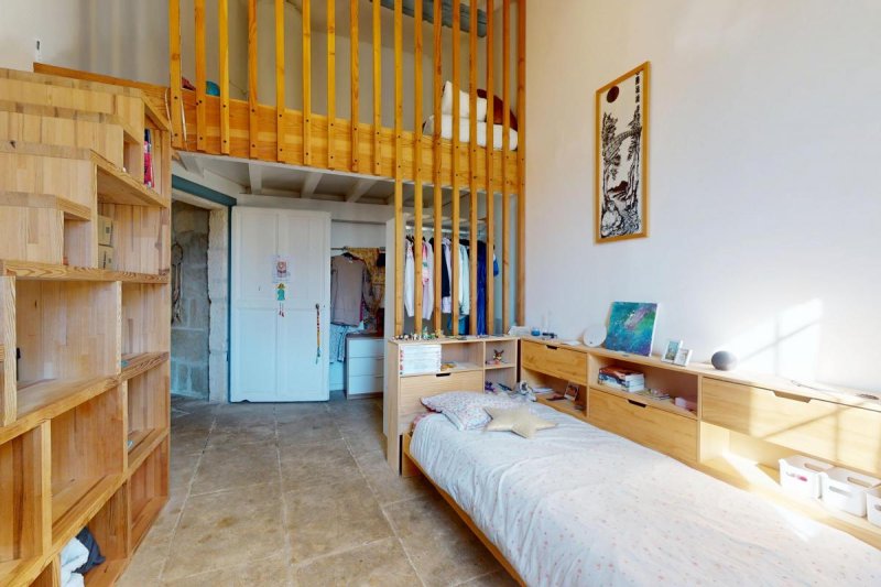 D'abord un salon cosy avec un poêle à bois qui trône au sein de l'ancien âtre et après quelques marches supplémentaires, nous trouvons sur le même niveau, la salle à manger qui ouvre sur une jolie terrasse ombragée. La cuisine dinatoire lui fait suite, parfaitement aménagée et équipée et enfin l'espace parental composé d' une chambre avec dressing et une salle d'eau.