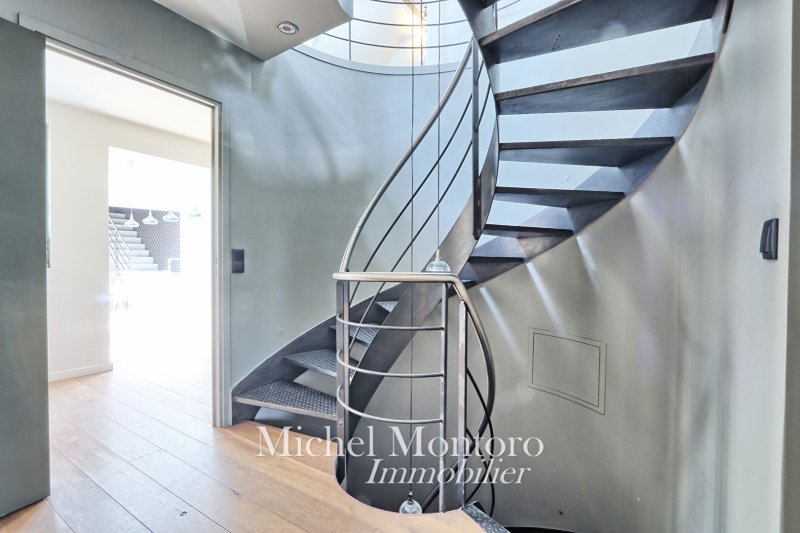 Un bel escalier en colimaçon mène au dernier niveau, qui offre un espace ouvert aménagé en salon de lecture, deux chambres supplémentaires avec rangements, et un espace grenier.