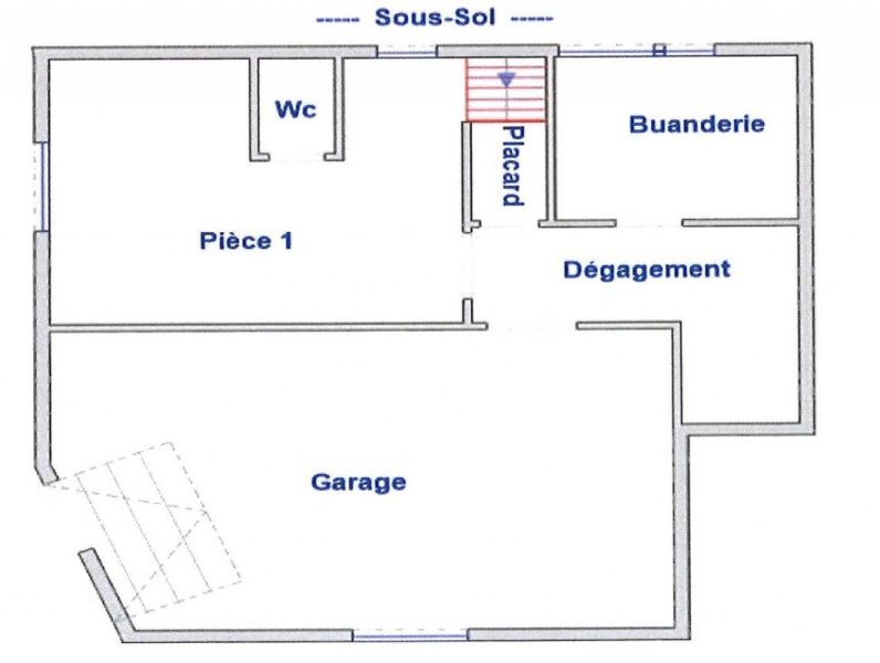 Entrée, 2 chambres, salle d'eau avec WC, cuisine, séjour orienté Sud/Ouest, une pièce complémentaire au sous-sol (à usage de bureau ou salle de jeux).