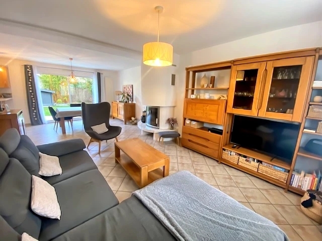 DESCRIPTIF DE CETTE MAISON À VENDRE : Entrée, Cuisine E/a , Séjour transversal avec cheminée et accès Grande Terrasse arrière, 5 Chambres dont 1 rdc, Salle de bains (Baignoire et douche), Salle dEau, 2 Water-closet, Buanderie, Garage, Cave. Dépendances : Chalet en Bois, Stationnement.