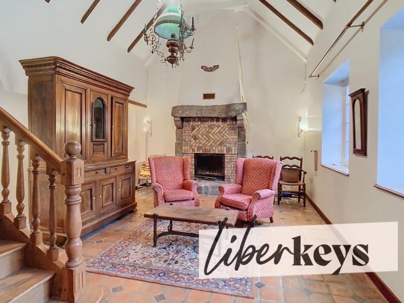 Sur la droite, vous accédez à un grand salon cathédrale chauffé par une cheminée, un escalier mène à une mezzanine avec espace nuit possible, espace détente ou bureau donnant accès aux combles.