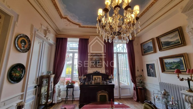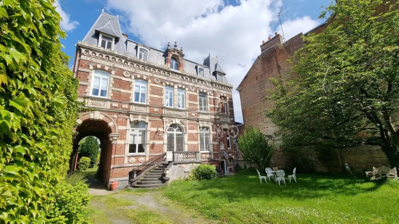 ABBEVILLE (80100) SERENO vous propose à 2 h de Paris, 40 minutes d'AMIENS, 27 mn de St VALERY SUR SOMME, 24 mn du CROTOY, 37 mn de FORT MAHON PLAGE, hyper-centre historique d'ABBEVILLE. UNE DEMEURE HISTORIQUE construite fin 19e siècle d'une surface bâtie totale utile de 673.67 m² (250 m² habitables et hauteur des plafonds 3.75 m) + une vérenda de 42 m² + un grenier de 124 m² + grand sous-sol aménagé de 80 m. LA DEMEURE PRINCIPALE, RDC entrée, salon, réception, cuisine, arrière cuisine, toilettes, premier étage 6 chambres, salle d'eau, deuxième étage, grenier aménagé en 8 chambres de 124 m², hauteur de plafond 3 m à rafraichir, sur une parcelle arborée de 1500 m² clos de murs. LES DEUX DEPENDANCES dont l'une avec un double garage de 42 m² sur 8 m de hauteur + pièce d'habitation (toiture neuve) l'autre à restaurer peuvent permettre l'aménagement en bureaux, salle de réception ou pièce d'habitation. LA DEMEURE PRINCIPALE est en excellent état au niveau du gros oeuvre (restauration totale voici 3 ans, budget 295. KE): la construction des fondations, l'assainissement du bâtiment, l'élévation des murs et la réalisation de la toiture (photos drone couvreur). LA VERRIERE...