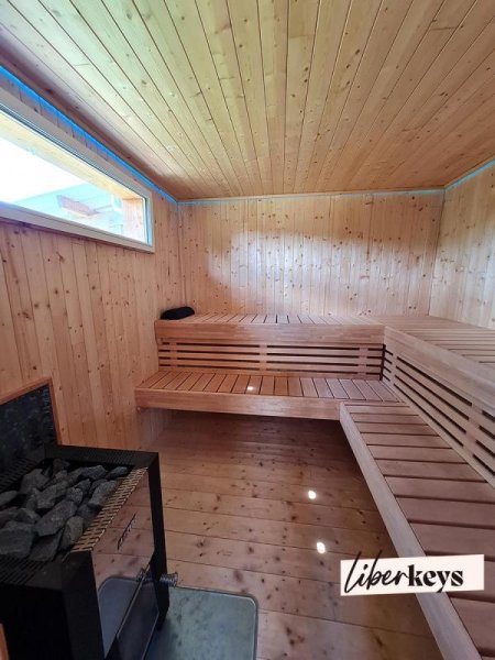 Ground floor: Entrance with cloakroom and WC, master suite with walk-in closet, bathroom/shower, and veranda; double living room with wood-burning stoves, formal dining room, premium open-plan kitchen, utility room/laundry.