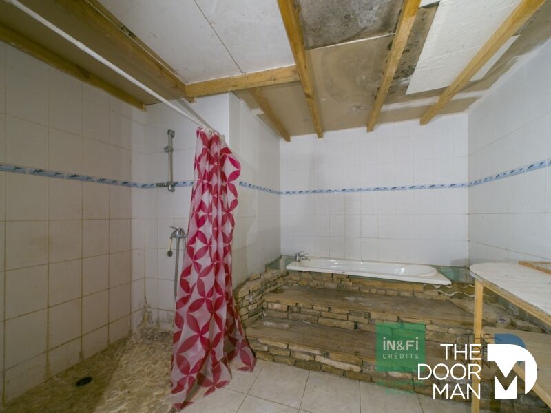 Une salle de bain double vasques avec douche et baignoire, une buanderie, un toilette et une pièce supplémentaire à aménager.