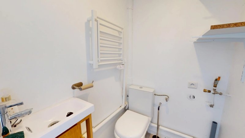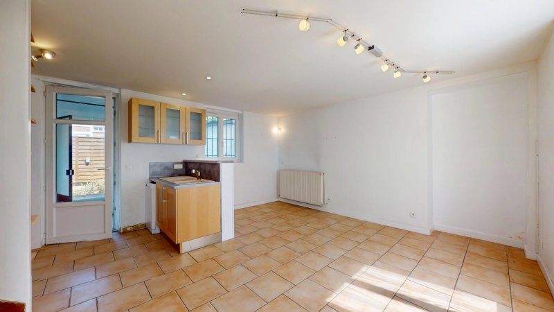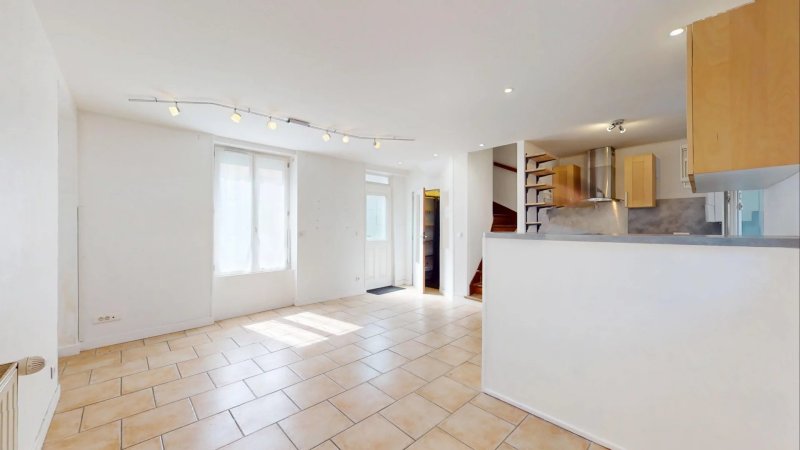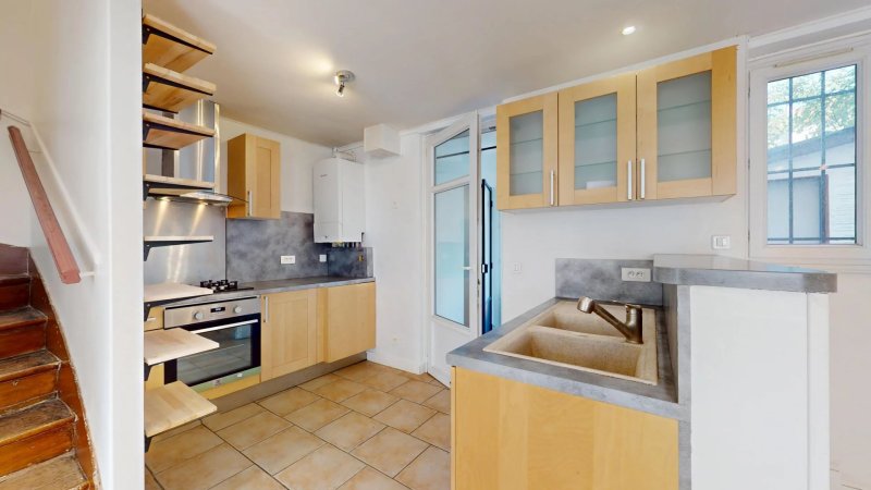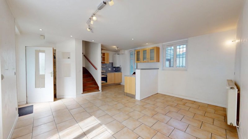 Au rez-de-chaussée, une pièce de vie lumineuse de 24 m² avec salon et cuisine ouverte, un WC indépendant et un coin buanderie.