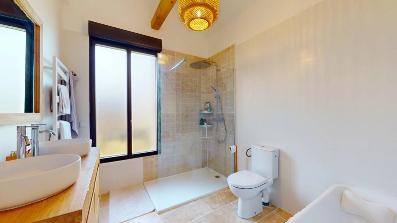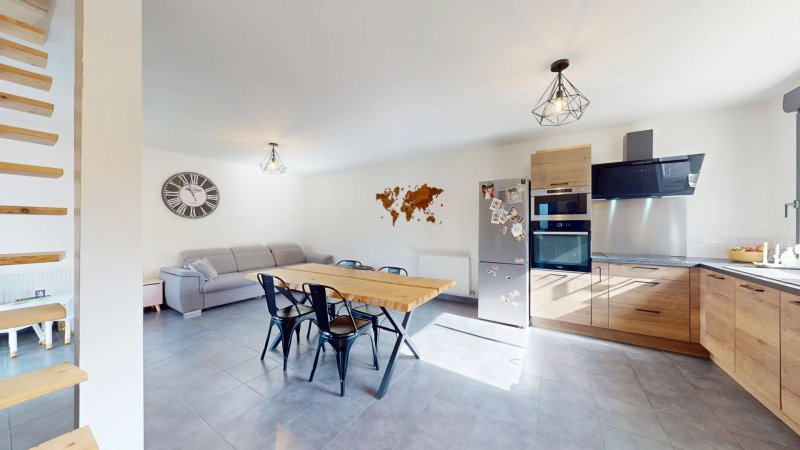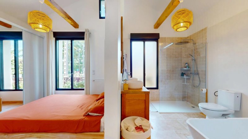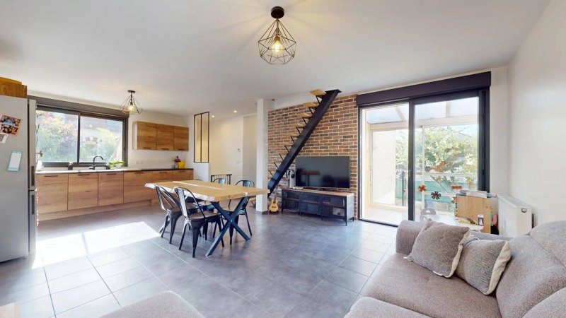 La maison offre au rez-de-chaussée un espace pour les pièces de vie de 33m2 + la véranda, réparti en un salon avec accès direct à la véranda et au jardin, une grande salle à manger et une cuisine familiale dinatoire ouverte sur l’ensemble. Toujours au rez-de-chaussée, vous trouverez deux chambres dont une suite parentale avec salle de bains (douche, baignoire et wc), et une salle de douche avec wc.