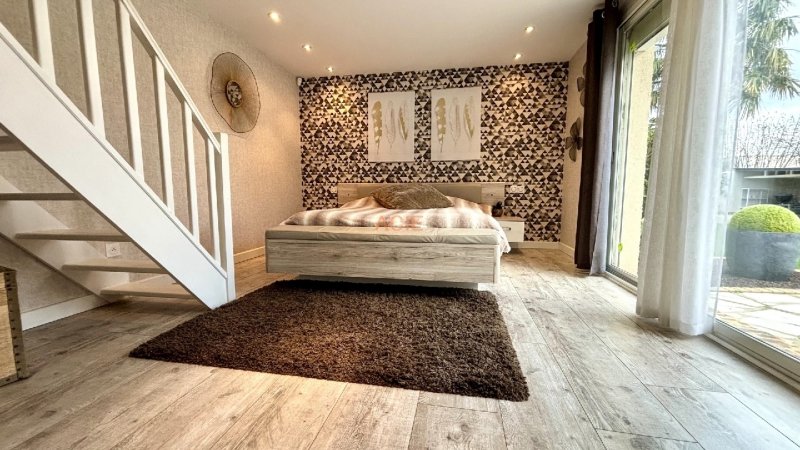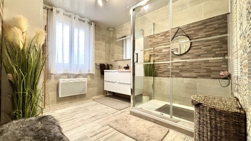 Entrée avec rangement, salon-séjour de 46m2 avec cheminée et accès au jardin, cuisine fermée moderne et toute équipée, une suite parentale avec dressing à l'étage et sa salle d'eau wc, buanderie, une deuxième salle d'eau et wc séparé.