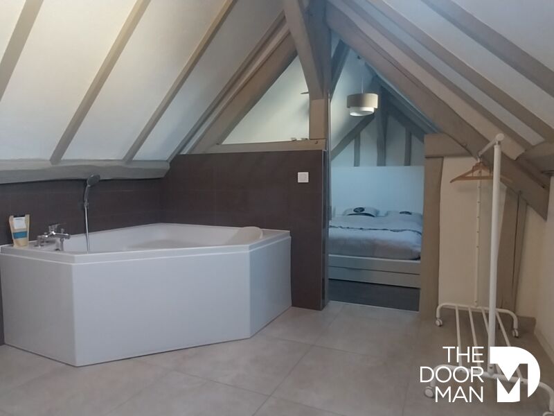 À l'étage, vous profiterez d'une pièce palière pouvant servir de bureau ou de chambre d'appoint, ainsi que d'une superbe suite parentale avec baignoire et WC.