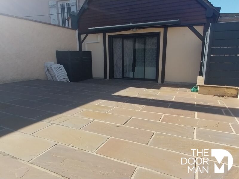 Vous apprécierez une grande terrasse en pavés de rue d'environ 80 m², idéale pour recevoir vos amis.