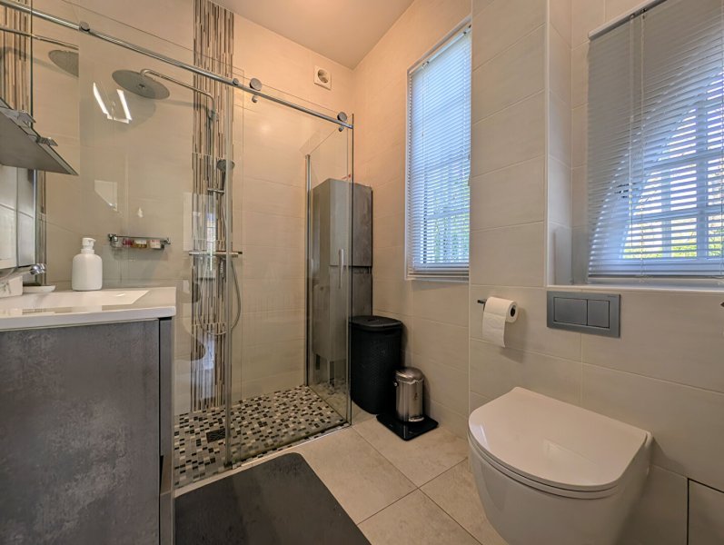 Elle se compose d'une entrée avec placard, séjour de 21M² avec cheminée, salle à manger attenante à une belle véranda de 17m² offrant un accès au Jardin, cuisine aménagée indépendante, un bureau, salle d'eau avec WC.