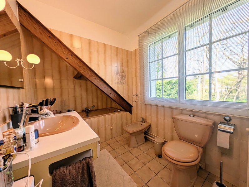 A l'étage : palier desservant 3 chambres avec placards, salle de bains avec WC.