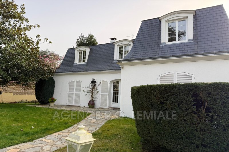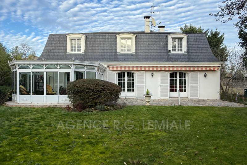 AGENCE RG LEMIALE: au coeur du parc, très belle maison familiale de style Mansart, idéalement située, en très bon état, proche des écoles notamment l'Ermitage international School Paris- IB School. Moins de 20 min à pied du RER. Au rez-de-chaussée un hall d'entrée, un WC avec lavabo, un séjour double donnant sur le jardin, une grande véranda Chauffée, une salle à manger, une cuisine équipée. Espace nuit : une chambre avec accès jardin, une salle de douche avec WC. Au premier étage : cinq chambres dont une avec dressing, une salle de bains avec WC, une salle de douche, un WC japonais. Au sous-sol : une buanderie, une chaufferie, un atelier, un garage pour 2 à 3 voitures. Un beau jardin arboré et très agréable sans vis-à-vis, un barbecue en pierre.